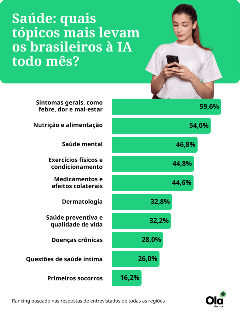 Os dados do Olá Doutor, plataforma de consultas online via chat, que realizou um estudo para entender como os pacientes vêm usando tecnologias de inteligência artificial para esclarecer dúvidas sobre o próprio corpo e organismo. A pesquisa ouviu pessoas de diferentes regiões do país e analisou desde a frequência de uso dessas ferramentas até os temas de saúde mais buscados pelos usuários.