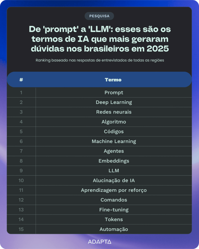 Para identificar os termos do universo da IA que mais geram dúvidas nos brasileiros, nas últimas semanas, a Adapta ouviu 500 brasileiros conectados à internet e usuários das tecnologias, que compartilharam as palavras, siglas e expressões que ainda não conseguem entender em 2025. Após análise das respostas, os termos mais citados foram dispostos em um ranking, onde é possível conferir aqueles mencionados no maior número de respostas entre os ouvidos.